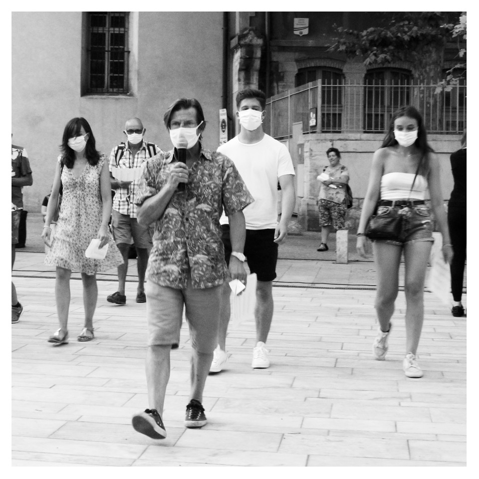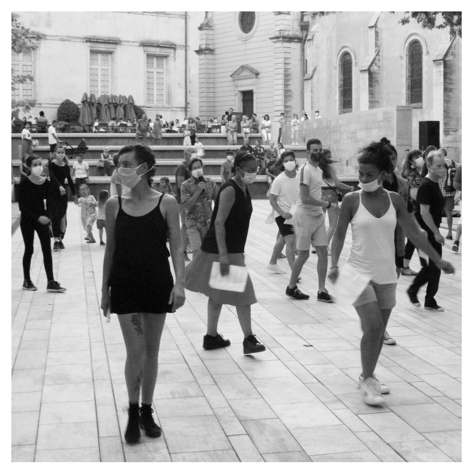 Photos ci-dessus, de gauche à droite: (1) Représentation de la Danse des éventails en Juillet 2020 ; (2) et (3) : Immédiatement après la représentation, le public est invité sur l’espace scénique et fait l’apprentissage, cinétogramme Laban en main, d’un extrait simplifié de la chorégraphie, guidé par Noël Cadagiani et par les danseurs répartis dans le public.